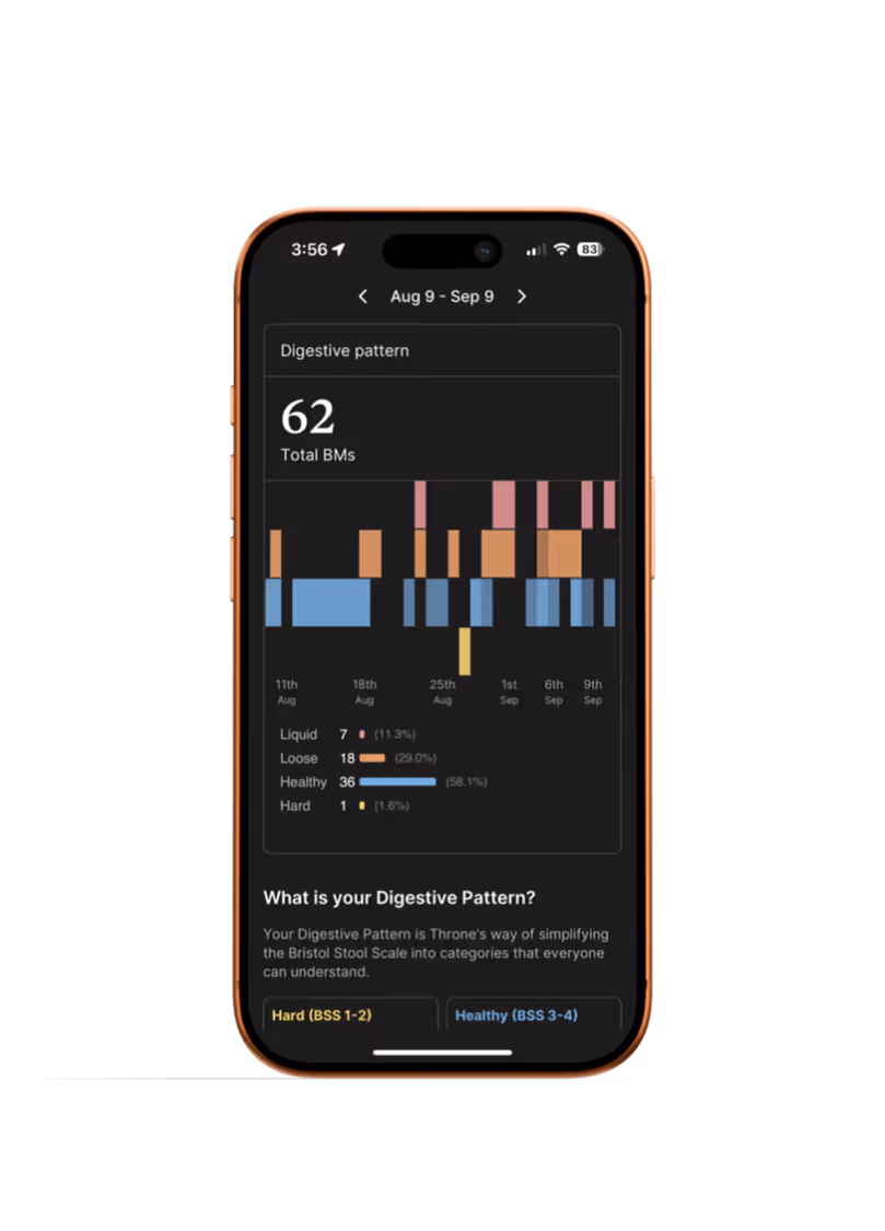 Throne monitors gut health and urinary wellness through comprehensive metrics like stool consistency, hydration levels, and digestive patterns.