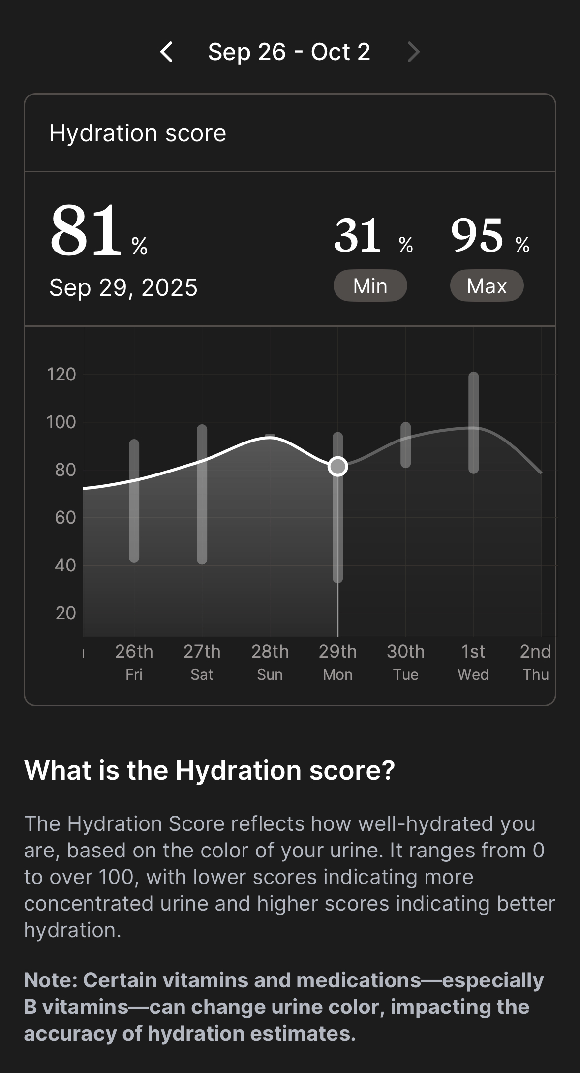 By analyzing urine color and concentration, Throne estimates hydration status and translates it into a simple, actionable score. You’ll see it change throughout the day, improving when you drink more water, declining if you’re not replenishing enough.