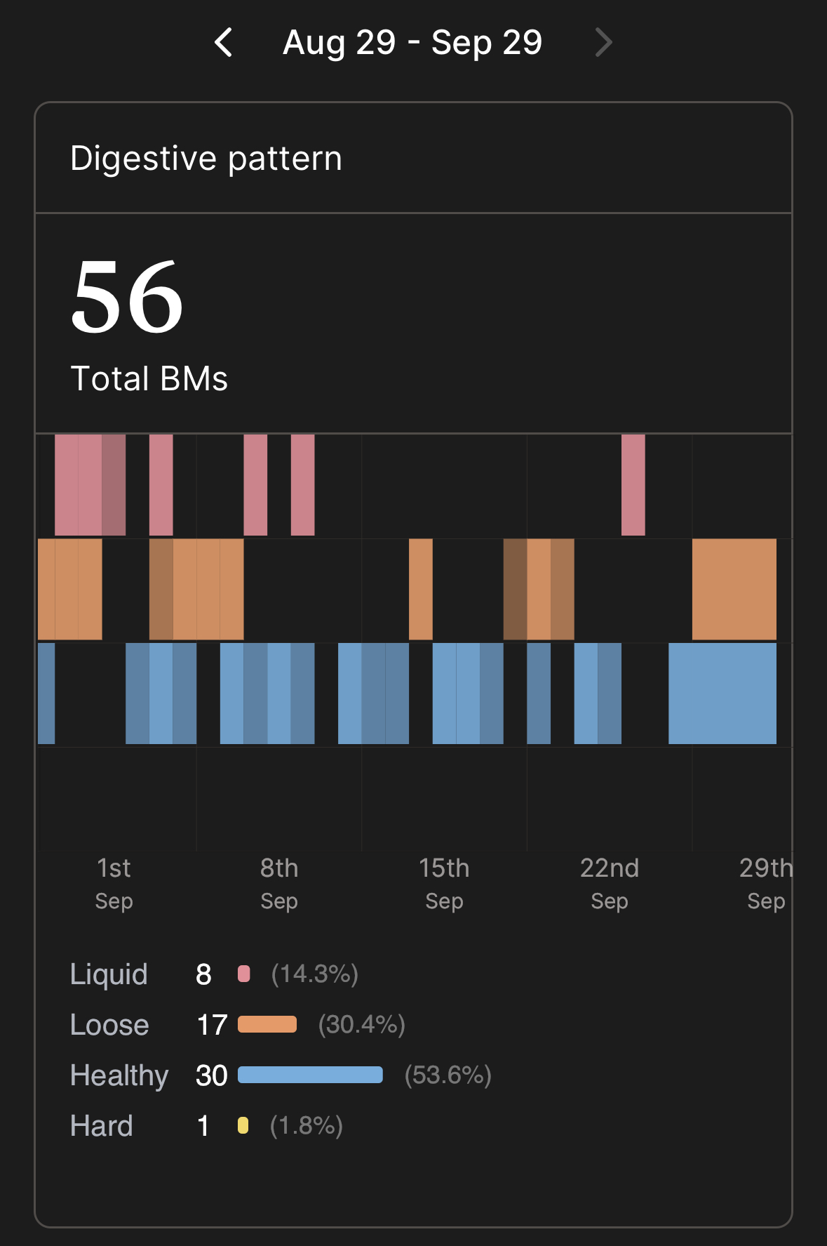 - Consistency: Classified by the Bristol Stool Scale – the medical gold-standard for describing stool texture, ranging from hard, to healthy, to loose, to liquid.
